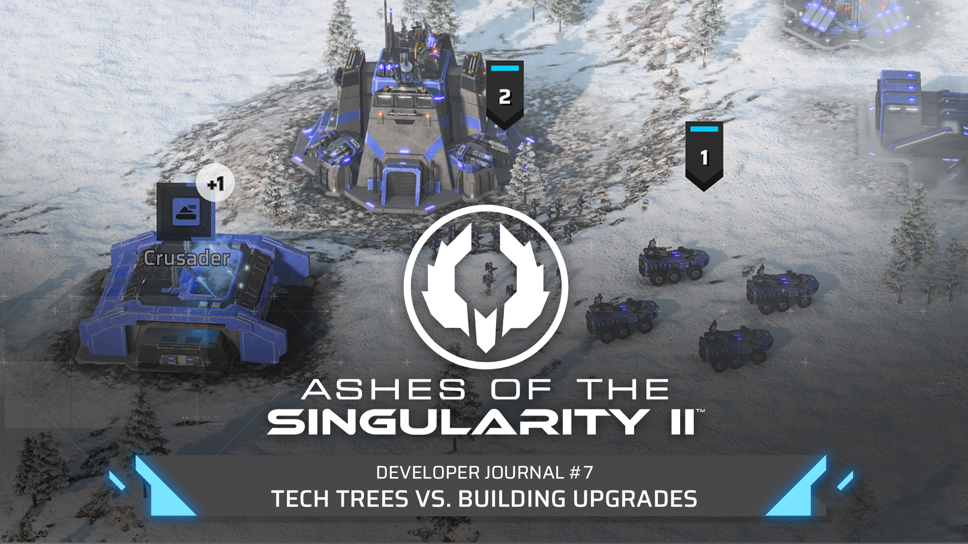 So here we are again, Ashes of the Singularity II. One of the biggest design philosophy shifts from the first game is to slow down the APM requirements, in order to add more strategic depth to the game. Which brings back the question of when to have unlocks handled through the tech tree vs. when to have them handled by buildings: